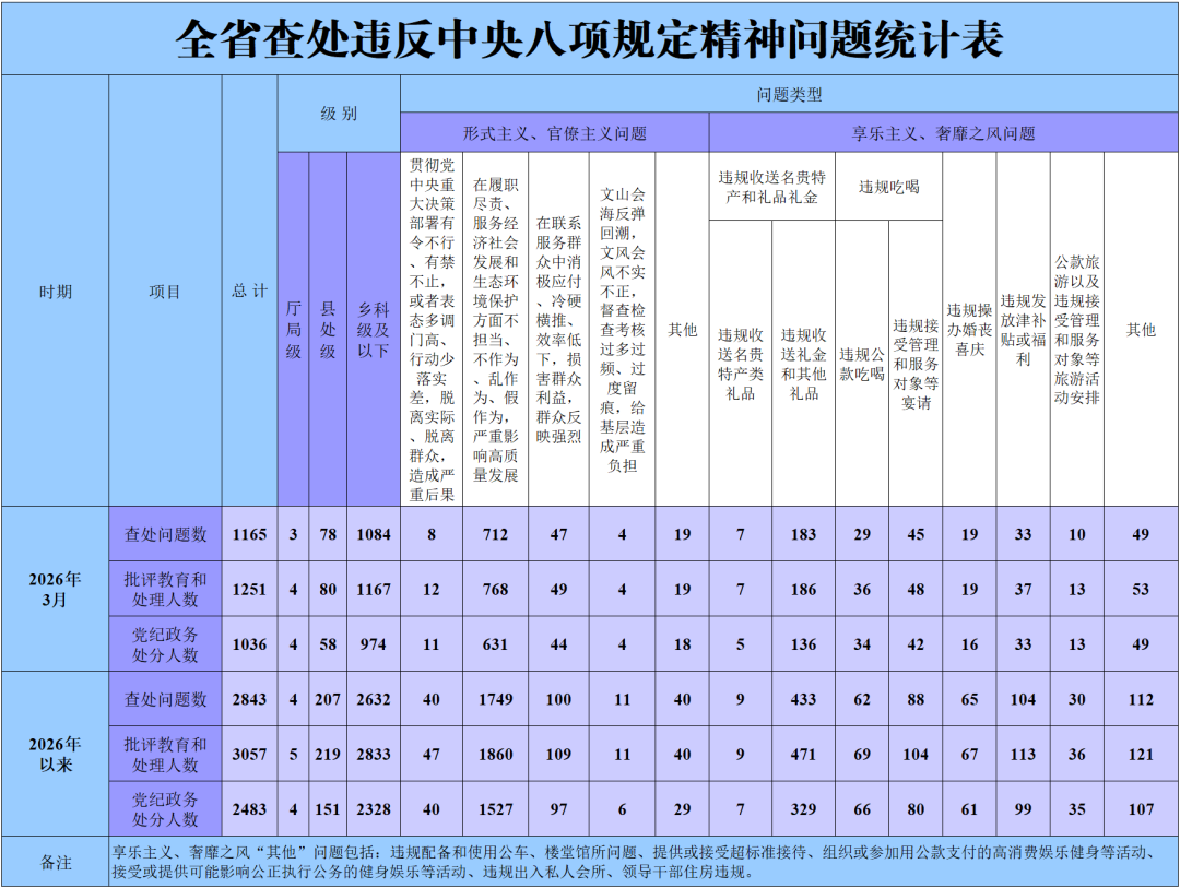 2026年3月,黑龙江省纪检监察机关共查处违反中央八项规定精神问题1165起,批评教育和处理1251人,其中党纪政务处分1036人。